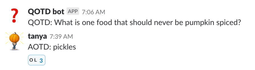 At MeetEdgar, we have a daily Question of the Day in our Slack watercooler. Anybody can add a QOTD, so sometimes the questions end up being pretty wacky. Thanks to QOTD bot, Iâve learned that peanut butter tastes great with sriracha and which other MeetEdgar team members had bowl cuts in the fourth grade like I did.